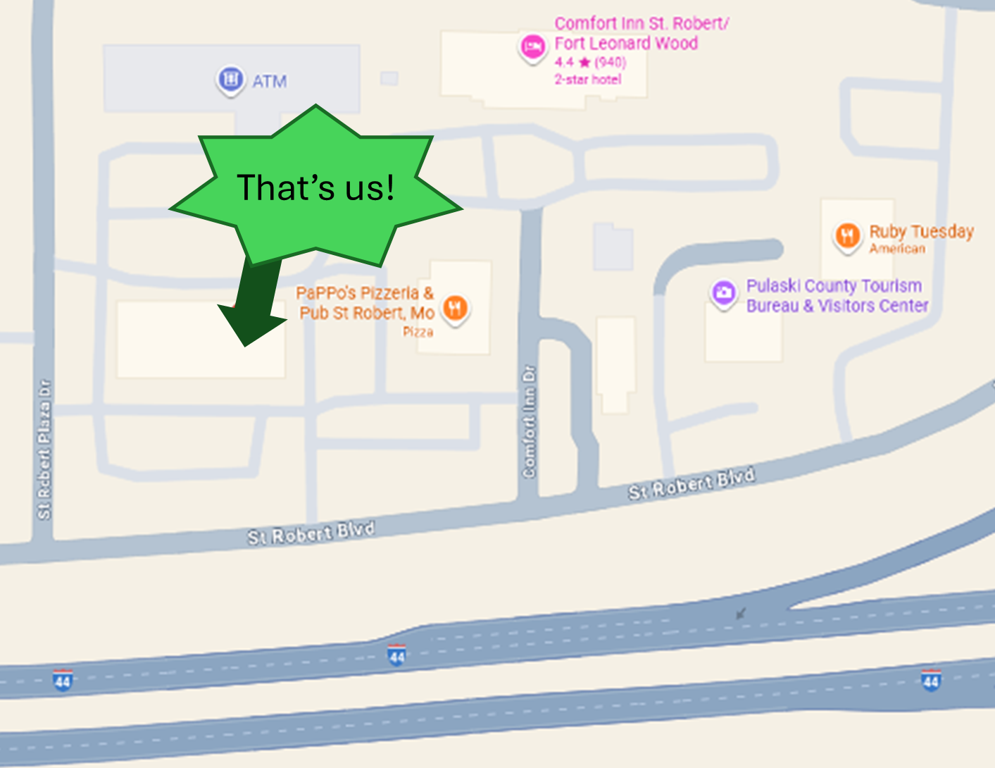 Off Interstate 44, St. Robert exit. Down St. Robert Blvd in the strip mall between Walmart and Pappo's. Shares the building with Jimmy John's and Mardiyama.